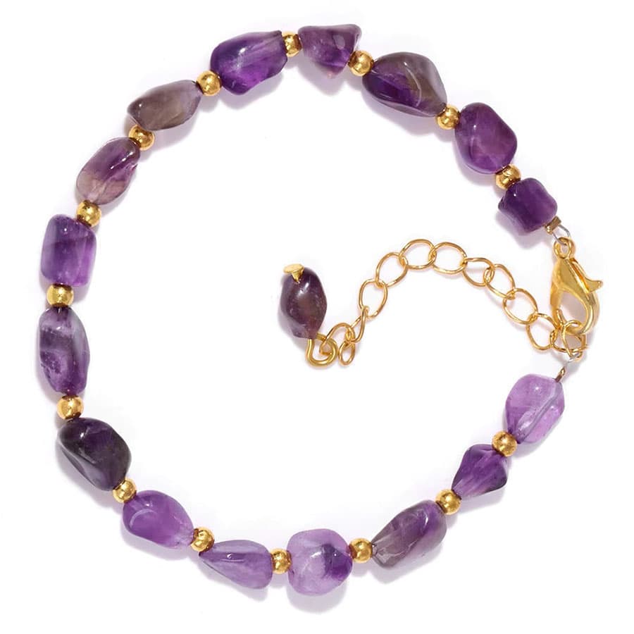 Deze amethist armband is met zorg samengesteld uit natuurlijke amethist edelstenen, elk met een diepe paarse glans en een kalmerende uitstraling. Amethist staat bekend als de steen van rust, helderheid en spirituele groei; het helpt je gedachten te verhelderen en balans te vinden. Door de unieke schakeringen in het natuursteen is iedere armband bijzonder en persoonlijk, terwijl het goud subtiel zorgt voor een elegante, tijdloze look. De energie van amethist ondersteunt je bij het loslaten van spanning, het bevorderen van innerlijke vrede en het versterken van je intuïtie. Met deze armband draag je dagelijks een herinnering aan jouw rust, kracht en het belang van luisteren naar jezelf.